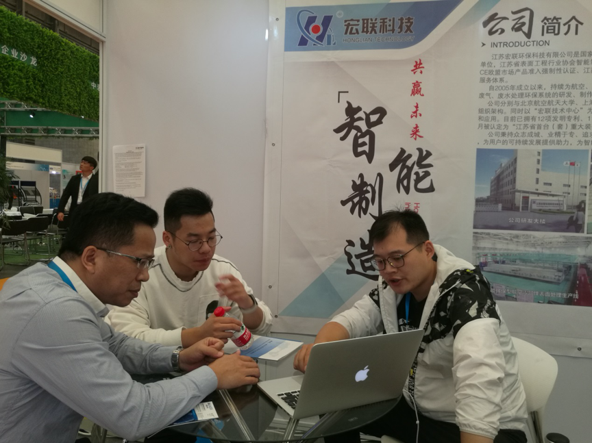 2019年国际表面工程展览会10月30日于上海新国际博览中心开幕,江苏宏联环保科技有限公司董事长吴欲带领公司10余人团队参加了本次展览会,展会上宏联科技以“智能制造,共赢未来”为主题,向行业同仁展示了宏联的新工艺和新产品。